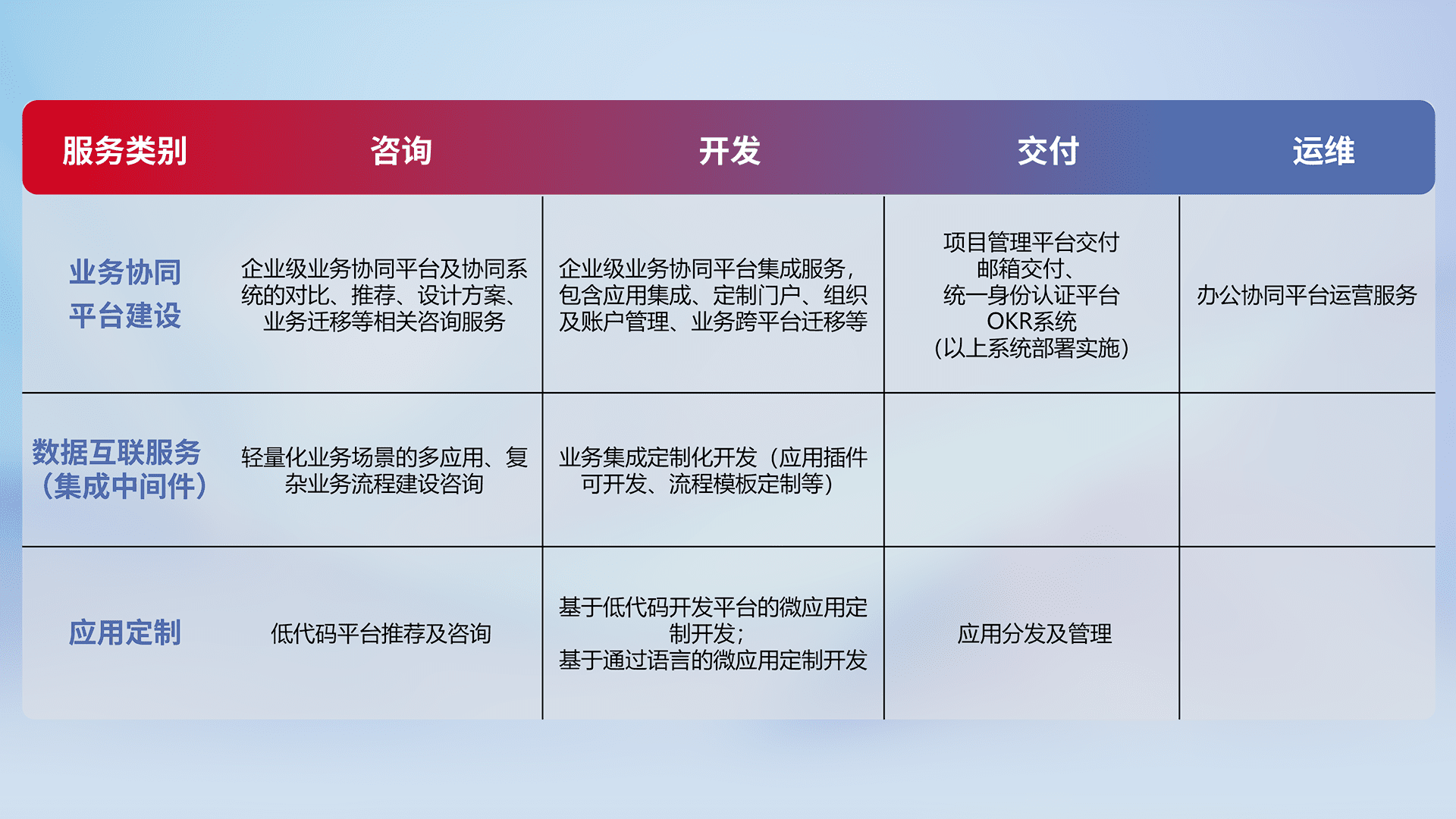 针对钉钉、、、企微、、、IDaas等平台级产品提供产品的规划、、、方案、、交付、、定制化开发等服务,,,,实现如统一协同办公、、、、智能客户服务、、、混合会议管理、、智能数据查询、、、、等业务场景,,实现数字化转型。。